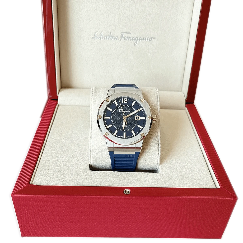 Designed for both function and durability, this Swiss-made watch is powered by high-precision quartz movement, ensuring accurate timekeeping with minimal maintenance. The stainless steel bracelet, fitted with a secure deployment clasp, offers both comfort and reliability for all-day wear. With a 100-meter water resistance rating, the Ferragamo F-80 is built to handle everyday activities, from work to leisure. The scratch-resistant sapphire crystal protects the dial, ensuring lasting brilliance and resilience against daily wear.