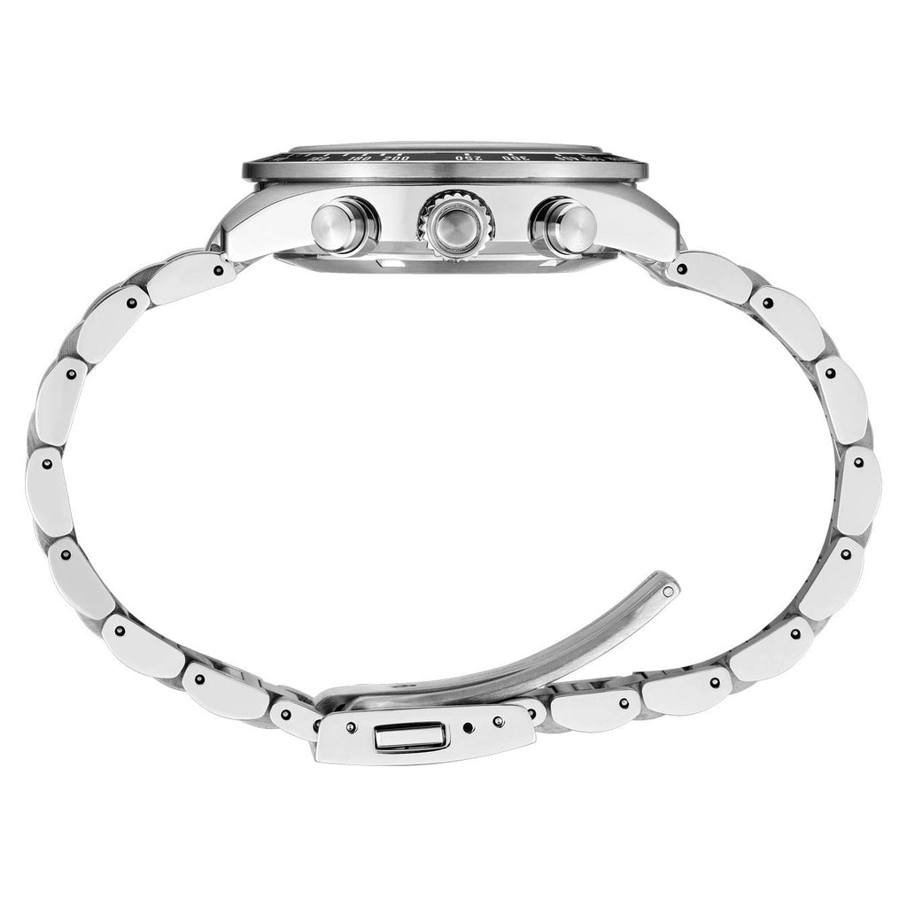 The chronograph function measures up to 60 minutes of elapsed time in 1/5-second increments and includes a split time function, while the solar cell, powered by any light source, with no battery change required, provides a 6-month power reserve when fully charged. Framed by a black tachymeter bezel, the pale blue dial with a brilliant sunray finish features three black subdials, with 24-hour and power reserve indicators, as well as a date calendar and LumiBrite hands and markers. Crafted of stainless steel, with a curved anti-reflective sapphire crystal, this timepiece includes a secure screwdown caseback and tri-fold push button release clasp. 10 bar, 100M Water Resistant