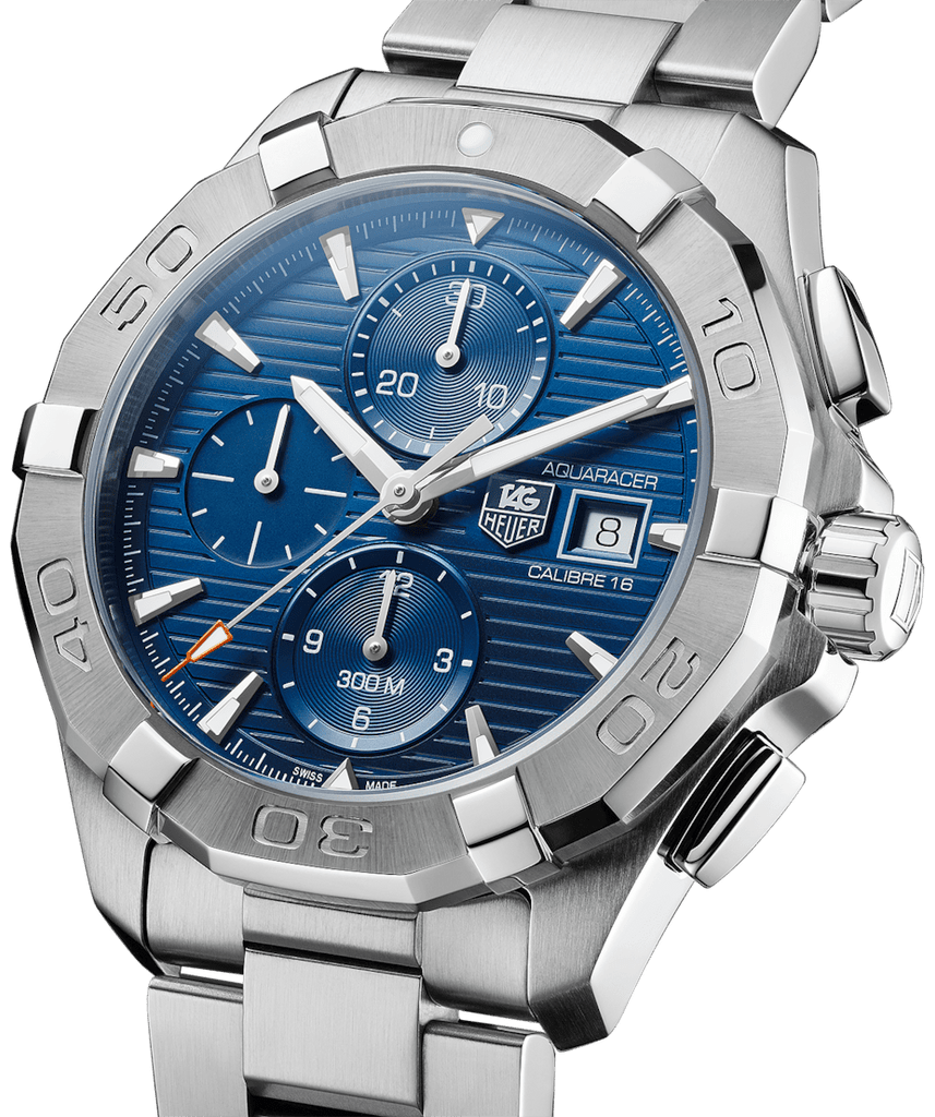 TAG HEUER Aquaracer Calibre 16 Gents Watch has a Stainless steel case with a brushed stainless steel bracelet. Unidirectional rotating stainless steel bezel. Blue dial with luminous silver-tone hands and index hour markers. Minute markers around the outer rim.