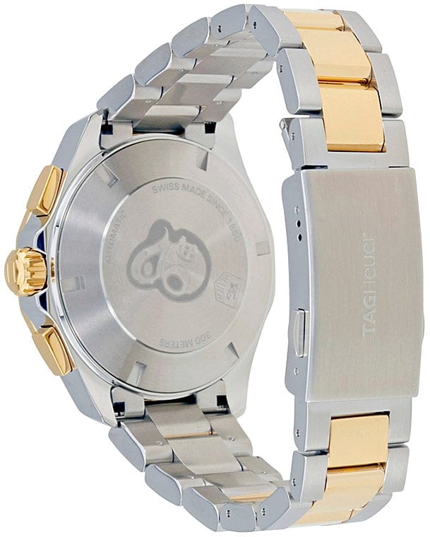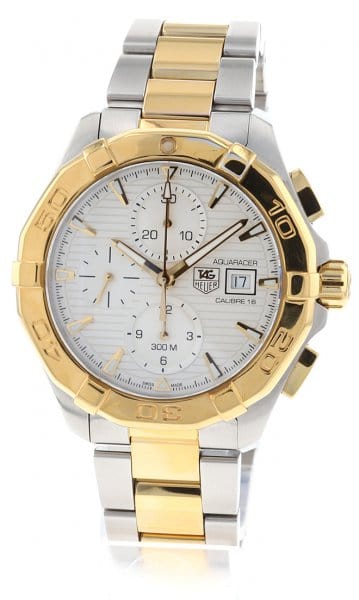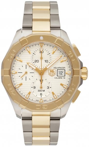 TAG HEUER Aquaracer Calibre 16 Gents Watch has a Stainless steel case with a two-tone (silver-tone and yellow gold-plated) stainless steel bracelet. Unidirectional rotating yellow gold-plated bezel. Silver dial with luminous yellow gold-tone hands and index hour markers. Minute markers around the outer rim.
