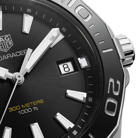 A quartz men's watch with black dial, black aluminum bezel and 41mm case in fine-brushed and polished stainless steel. Rugged and handsome, it is designed for the depths, and reliable in even the most challenging conditions.