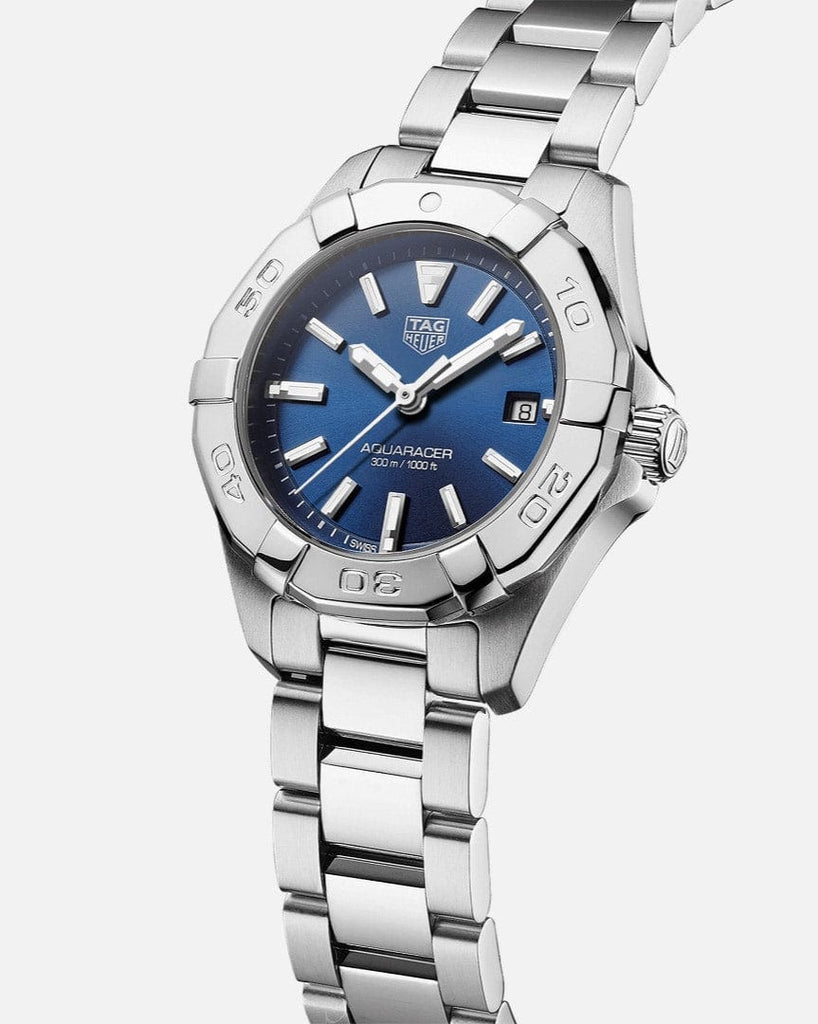 Powered by a reliable quartz movement, this high performance TAG Heuer Aquaracer Ladies’ Watch boasts a stunning midnight blue dial with luminescent hands and baton hour markers and a date window at 3 o’clock.
