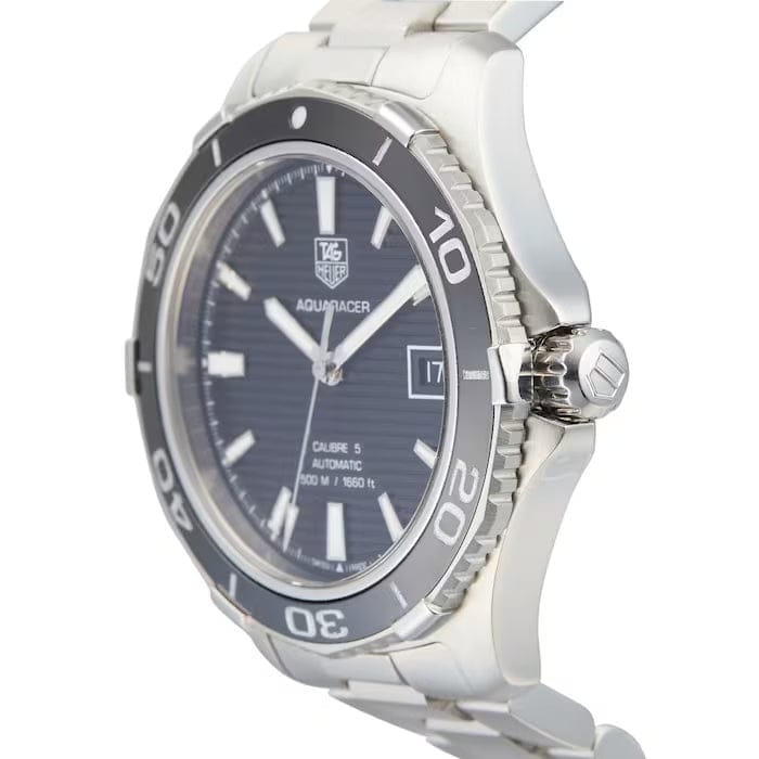 Screw down crown. Solid case back. Case diameter: 41 mm. Case thickness: 10 mm. Round case shape. Band width: 17 mm. Deployment clasp with a push button release. Water resistant at 500 meters / 1650 feet. Functions: date, hour, minute, second. Sport watch style. Watch label: Swiss Made. Tag Heuer Aquaracer 500 Automatic Mens Watch WAK2110.BA0830.