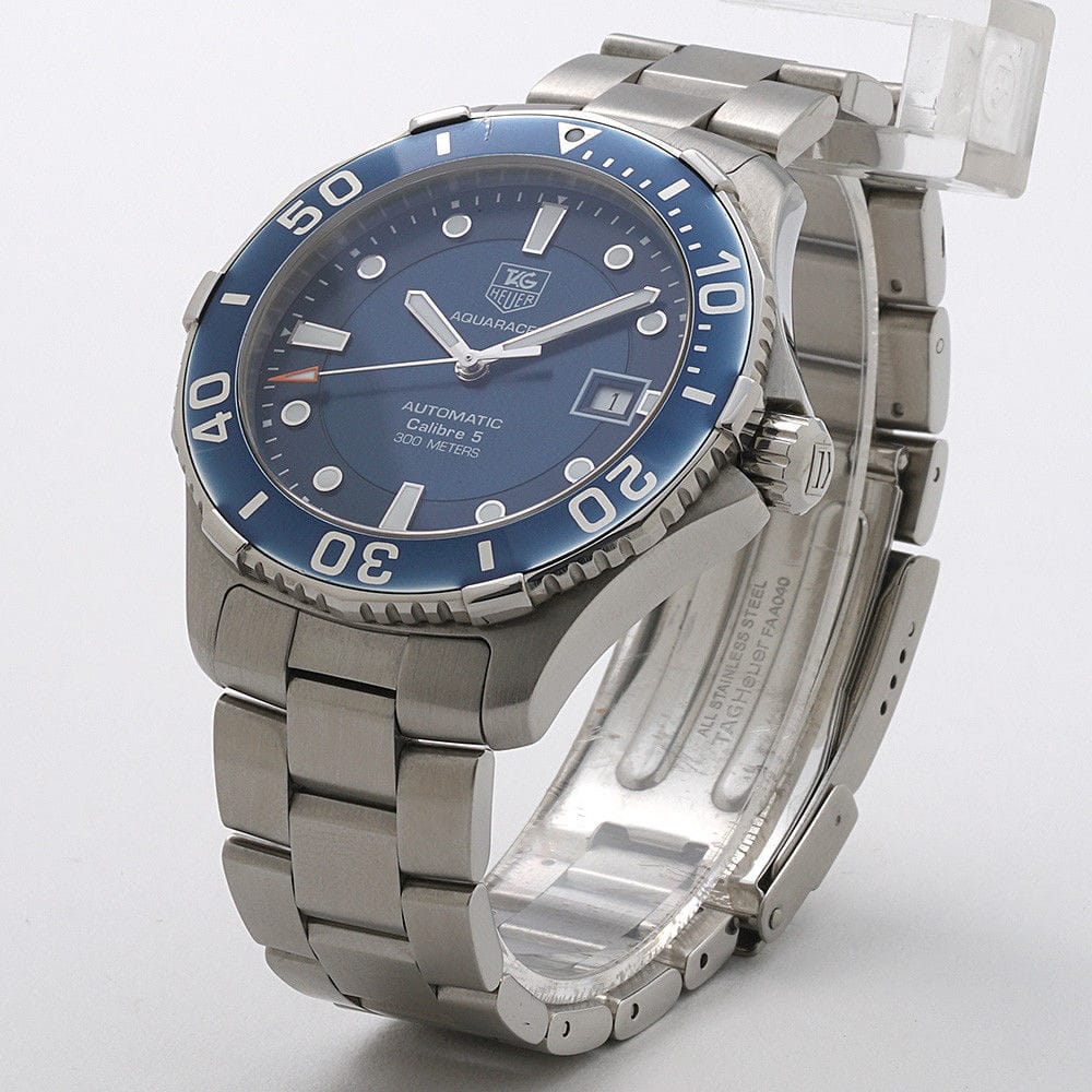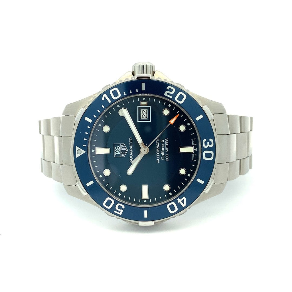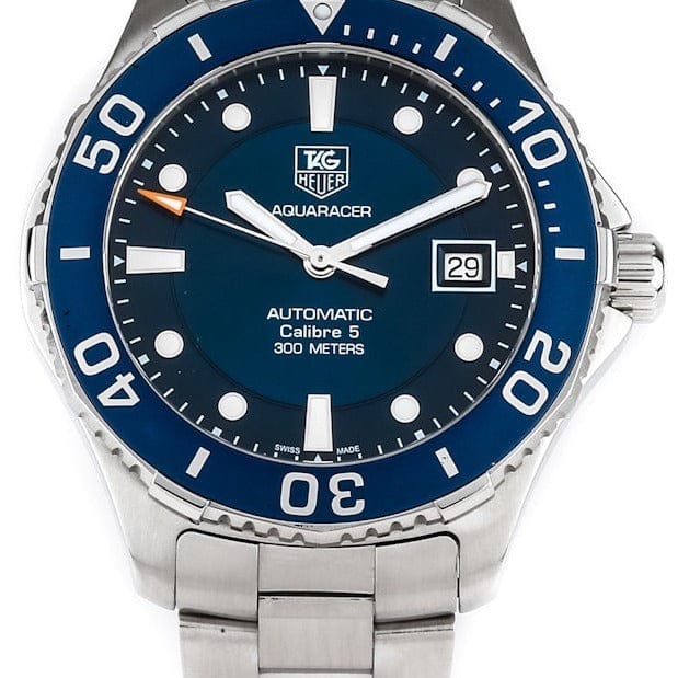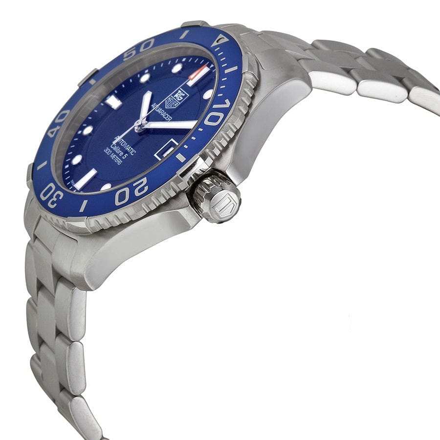 Tag Heuer Aquaracer Calibre 5 Blue Dial Men's Watch WAN2111-BA0822 - Swiss Made ,Blue Dial ,Dot Hour Markers ,Second / Minute Scale ,Blue Aluminum Bezel with 60 Minute Diving Scale ,Date Feature, Date Window Displayed at 3 O'Clock,38 Hour Power Reserve ,Self-winding Automatic Movement ,TAG Heuer Calibre 5 ,Vibrations Per Hour: 28,800 ,Jewels: 25, Brushed Stainless Steel Case ,Brushed Stainless Steel Bracelet, Anti-reflective Scratch Resistant Sapphire Crystal , 300 Meters / 1000 Feet Water-Resistant ,41mm = 1 5/8" Case, 7" Adjustable Bracelet ,Case Thickness: 12mm, Inlet Size: 20mm ,Unidirectional Rotating Bezel ,Solid Case Back with Diving Bell Engraving , Luminescent Hands & Hour Markers,Screw Down Crown & Case Back, Stainless Steel Deployment Buckle,Free Bracelet Sizing
