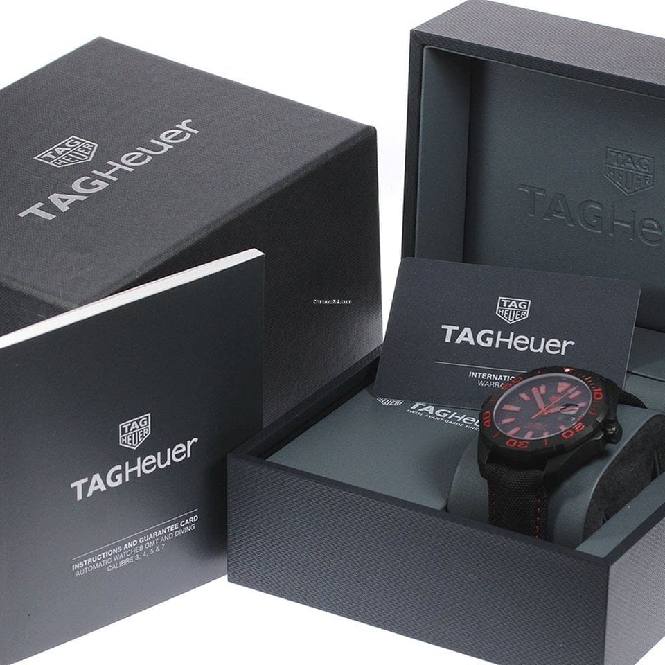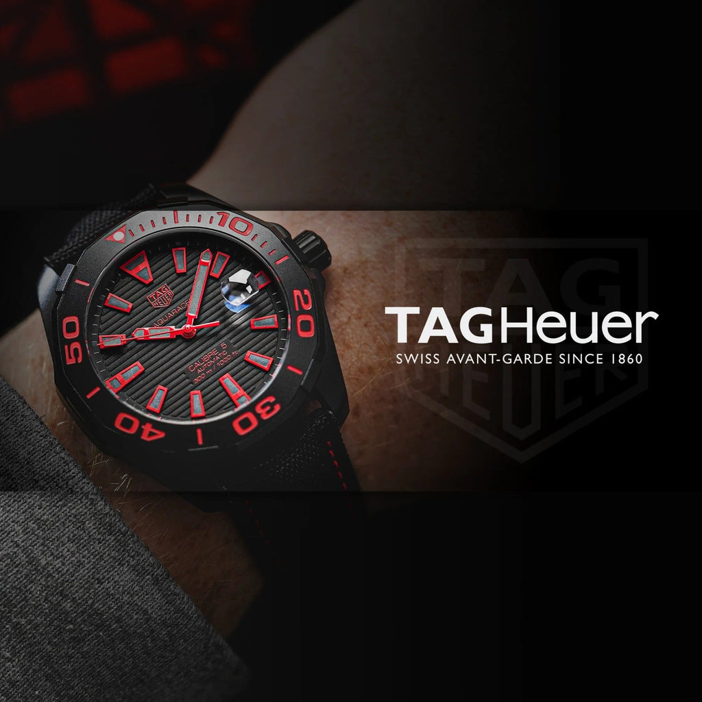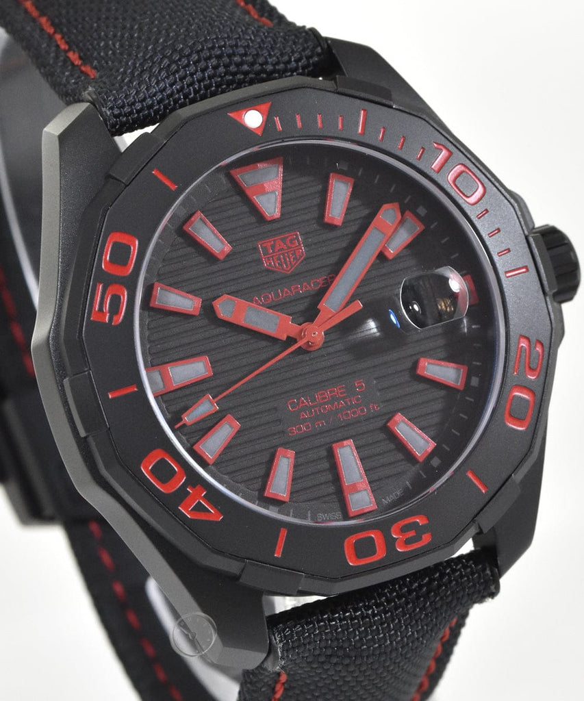Tag Heuer Aquaracer Automatic Men's Watch WAY208A.FC6381. This 43mm sport watch features a black titanium carbide coated titanium case, black nylon fabric strap and a black ceramic rotating bezel with a 60-minute scale. The black dial has luminescent hands and hour markers with a date window displayed at 3 o'clock and a horizontal streak effect. It is powered by the Tag Heuer Caliber 5 self-winding automatic movement with a 38-hour power reserve.