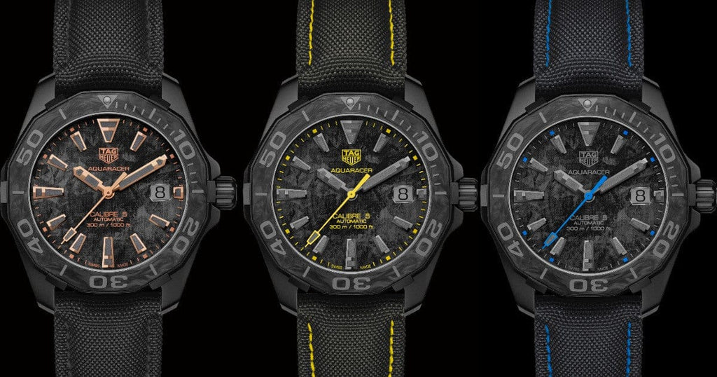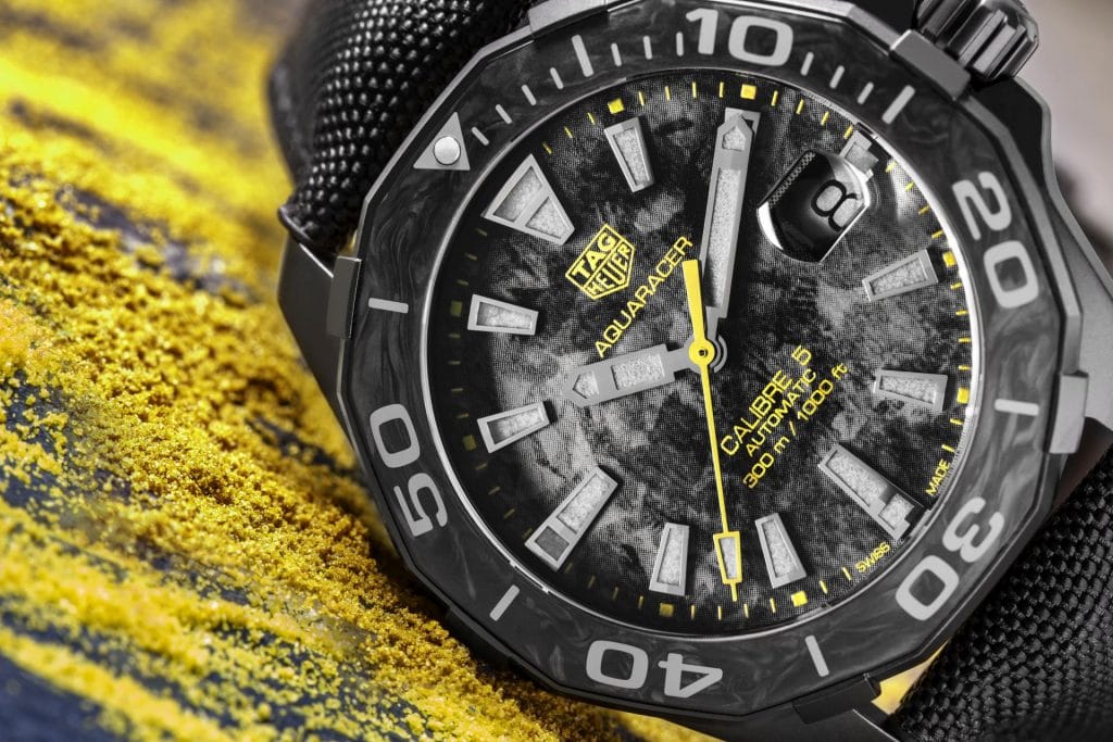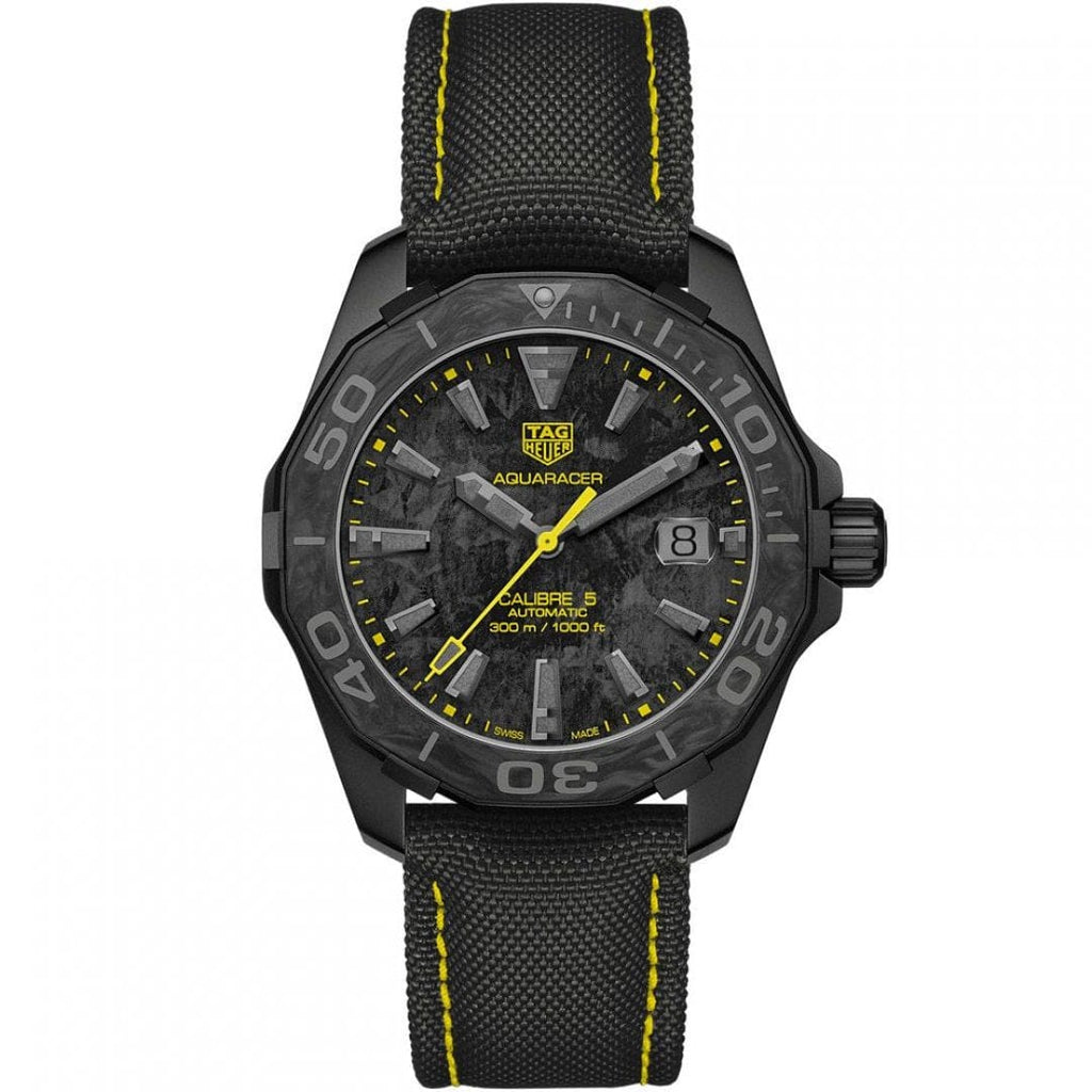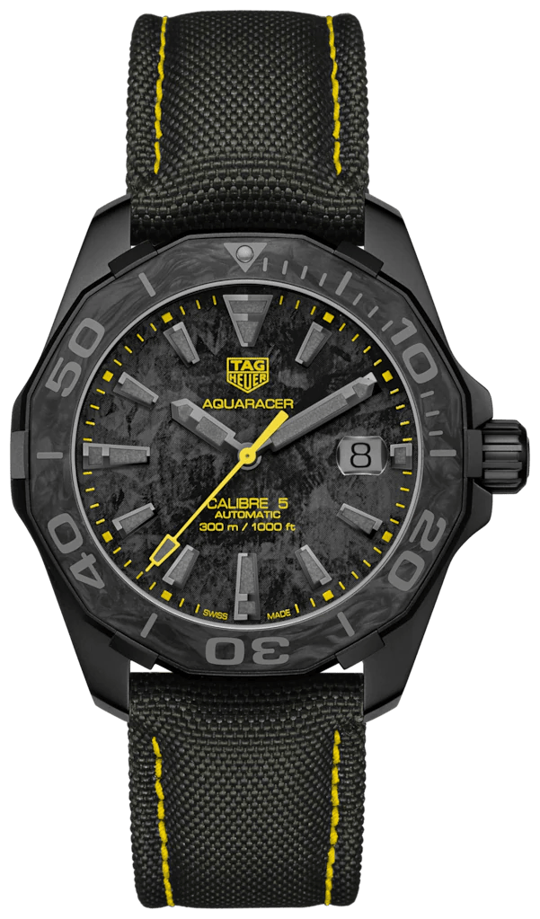 Swiss-made, this bold TAG Heuer Aquaracer is an aesthetic 41 mm watch. This model features a Titanium Carbon case and a Calibre 5 Automatic movement.