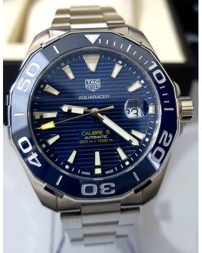 A vibrant blue unidirectional ceramic bezel with 12 facets matches the case and dial elements, with a 60-minute scale to measure elapsed dive time. Tag Heuer calibre 5 automatic movements, containing 25 Jewels, bitting at 28800 vph, and has a power reserve of approximately 38 hours.