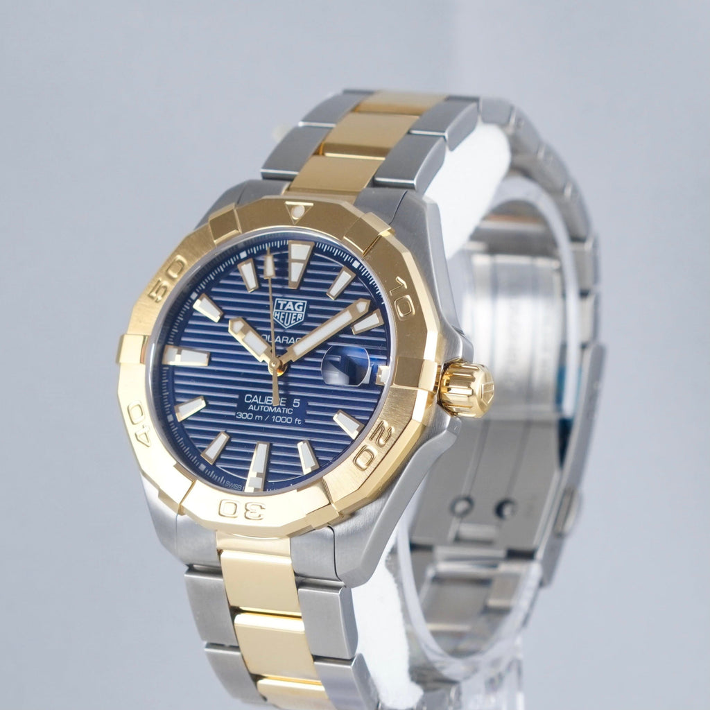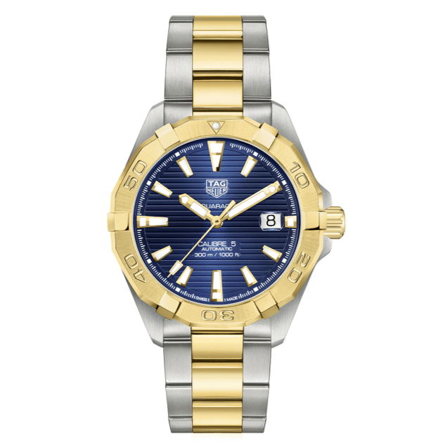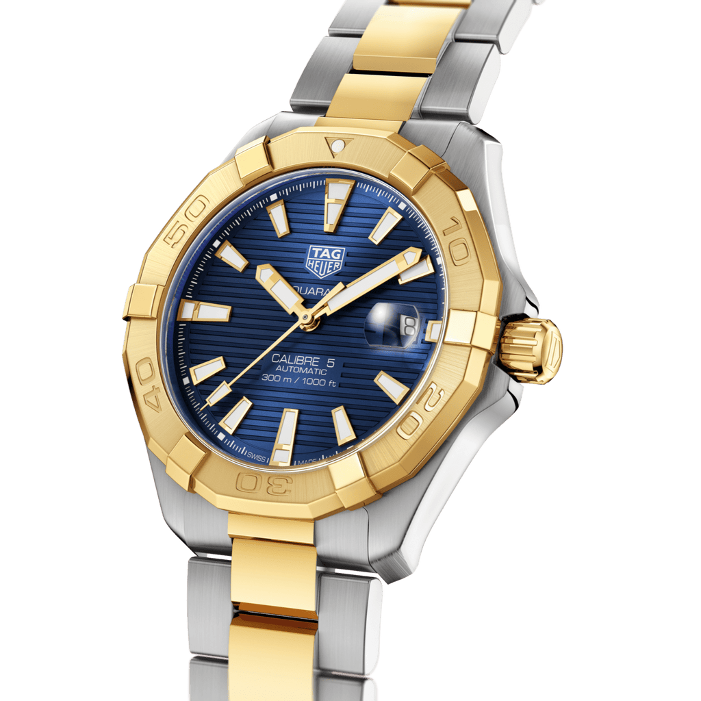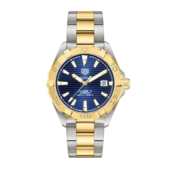 Upgrade your style with the Tag Heuer Aquaracer Calibre 5 watch for women. Featuring a blue dial and two tone steel strap, this timepiece is perfect for any occasion. With the precision of Calibre 5 movement, you'll always be on time. Elevate your look with this luxurious watch.