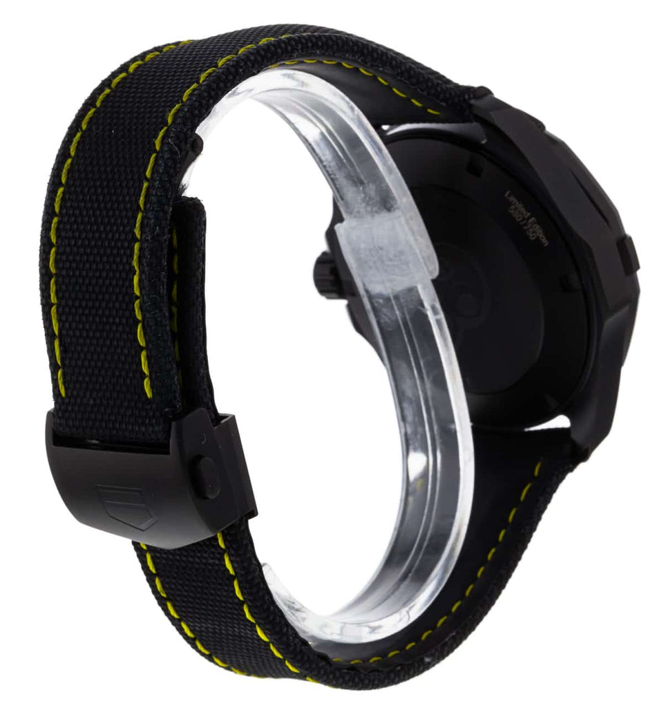 The bezel combines carbon and matte black PVD-coated steel, and is inscribed with the 60-minute scale characteristic of the Aquaracer and most of its dive-watch brethren. The screw-down crown at 3 o’clock is also made of matte-black steel, while the screw-on caseback is in PVD-coated titanium. The faceted indices and hour and minute hands are are polished and lacquered in rose gold, on the model pictured above, or plated with black gold, on the yellow- and blue-highlighted models, below, and treated with gray Super-LumiNova. The date window at 3 o’clock features a magnifying lens for easy reading in the depths or in the other low light conditions.