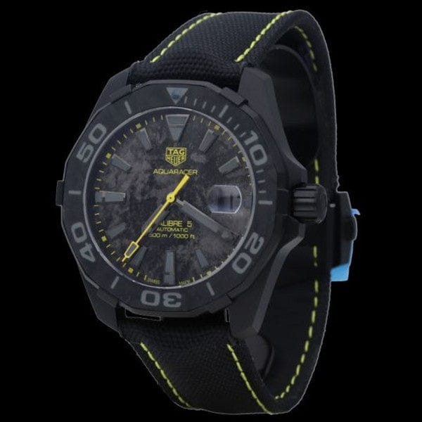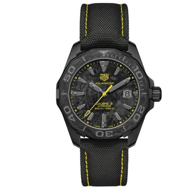 Swiss-made, this bold TAG Heuer Aquaracer is an aesthetic 41 mm watch. This model features a Titanium Carbon case and a Calibre 5 Automatic movement.