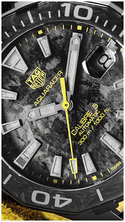 The TAG Heuer Aquaracer Carbon draws the eye with its 41-mm-diameter, black PVD-coated titanium case and imitation carbon-printed dials, which are highlighted with hints of blue, yellow, or rose gold depending on the model. The carbon material used for the watch’s unidirectional divers’ bezel is created by a random injection of carbon fibers into a resin pressed at high temperatures to achieve the black-and-gray marbled motif that differs slightly on each finished component, essentially making each watch in this collection a unique piece. The use of grade 5 titanium, with matte black PVD coating, as the case material means that the timepieces are as durable and scratch-resistant as they are lightweight, in addition to being water-resistant to 300 meters.
