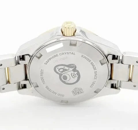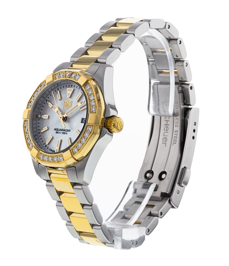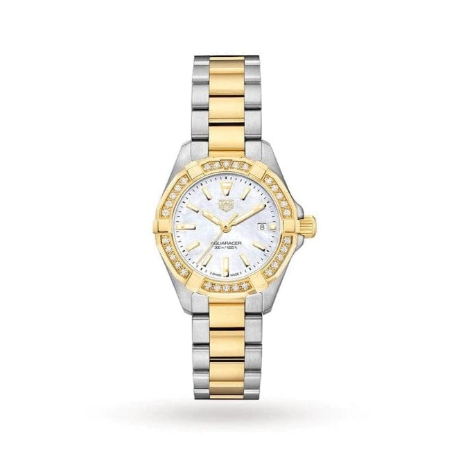 The TAG Heuer Aquaracer Quartz Ladies Mother of Pearl Steel & Yellow Gold Coating Watch has a stainless steel case. The rotating bezel has a gold coating and is set with 35 diamonds. The white mother-of-pearl dial perfectly complements the gold finish of the hands and hour markers. The watch is equipped with a Swiss Quartz movement, which is powered by batteries.