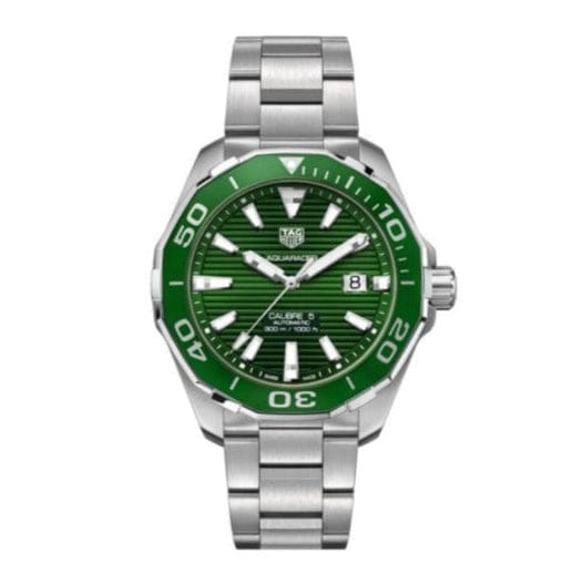 This TAG Heuer Aquaracer Mens Watch WAY201S.BA0927 features a 43mm Stainless Steel case, showcasing a Green dial and sapphire crystal glass. Powered by an Automatic movement, this stunning watch also showcases a Stainless Steel bracelet finished with a Folding Clasp for added security. This timepiece is also water resistant to 300 metres
