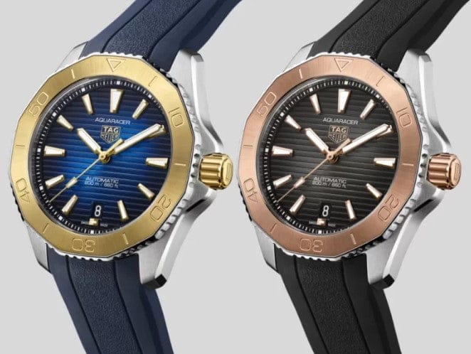 Luxury meets ultra-resistance in this showy TAG Heuer Aquaracer. The 18K 5N rose-gold bezel inlay and screw-down crown stand out next to the smoky-black dial adorned with highly legible hands and markers. A watch geared for every achievement.