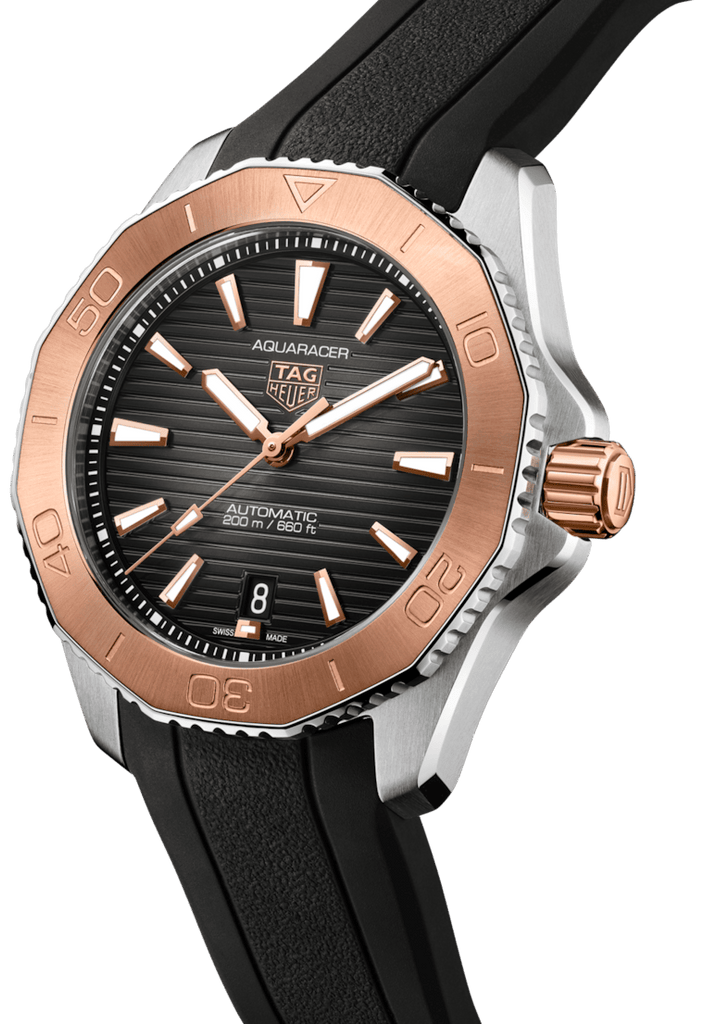 Luxury meets ultra-resistance in this showy TAG Heuer Aquaracer. The 18K 5N rose-gold bezel inlay and screw-down crown stand out next to the smokey-black dial adorned with highly legible hands and markers. A watch geared for every achievement.