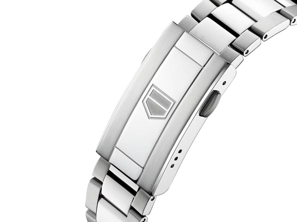 Highly functional and easy to adjust, the sleek yet robust steel bracelet has double safety-push buttons with an extension link for maximum comfort.