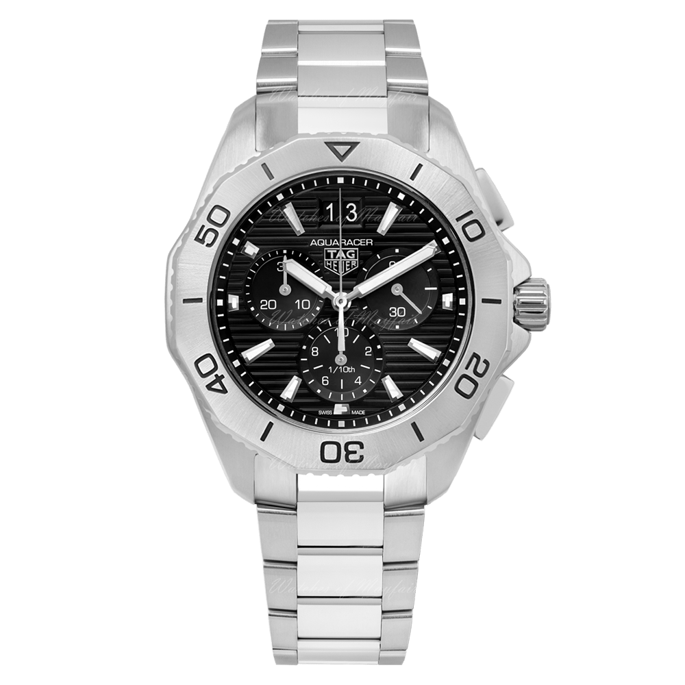 This Aquaracer model features a 40mm steel case with a coordinating bracelet and bezel.