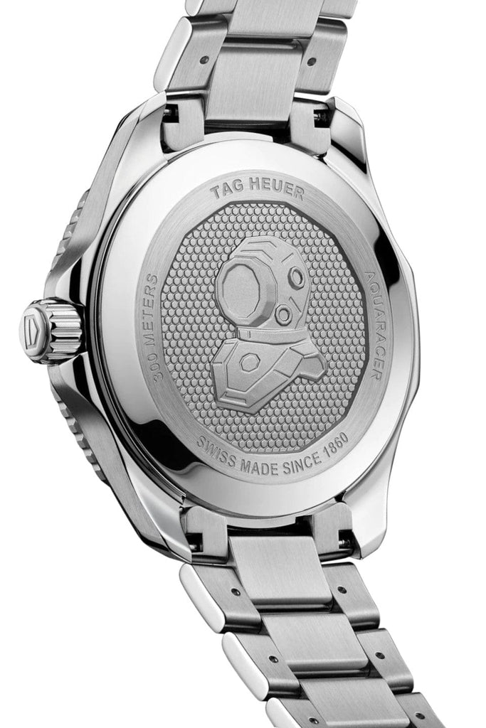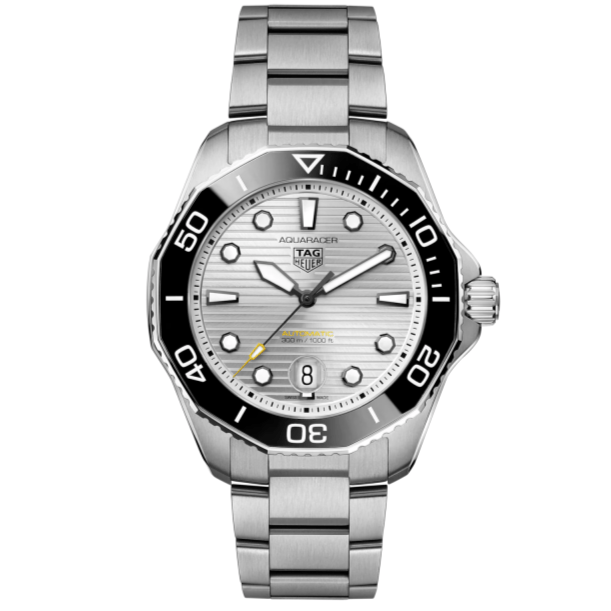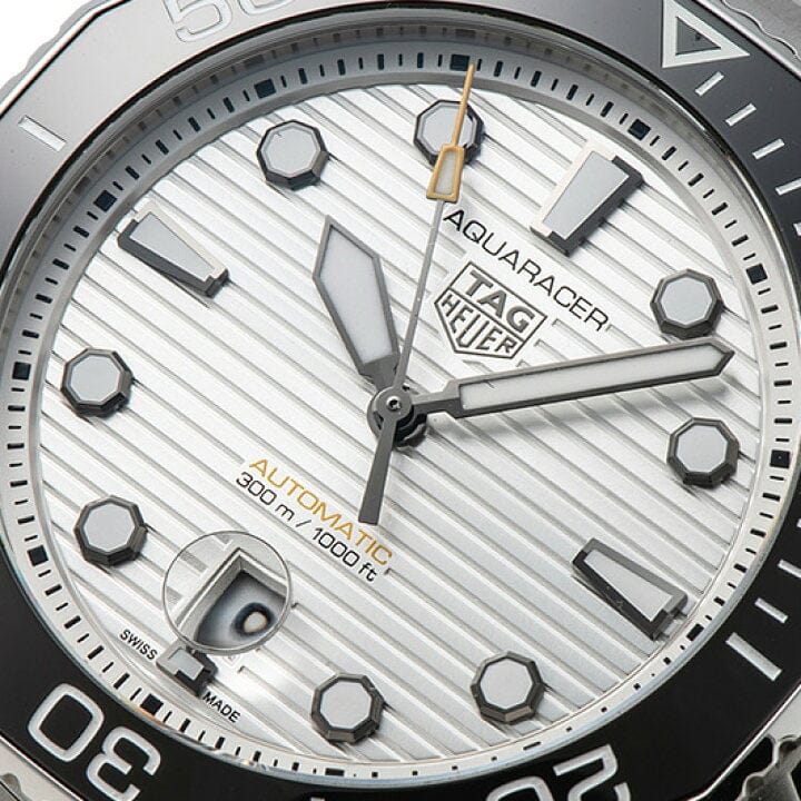 This new special edition TAG Heuer Aquaracer with a vibrant silver sunray brushed dial is a true diving watch. Bold black gold-plated hands and hour markers generously filled with white Super-LumiNova® for unrivalled legibility.