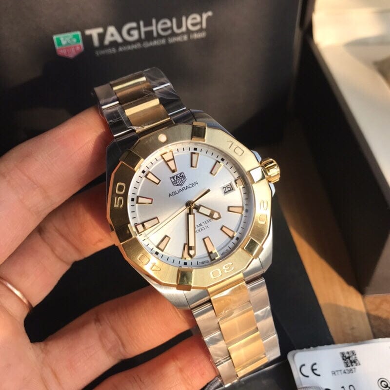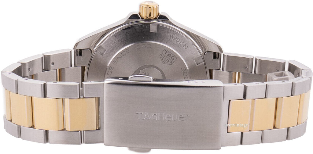 Brand New Authentic Tag Heuer Aquaracer 300M 41MM Yellow Gold and Stainless Steel Men's Watch Model WBD1120.BB0930. Stainless Steel case with Two-Tone Yellow Gold & Stainless Steel Brushed and Polished watch band. Folding clasp. 18K 2N Yellow Gold Uni-directional bezel. Dial description: Yellow Gold plated luminous hands and Index hour markers with minute markers around the outer rim on a Brushed Silver dial.
