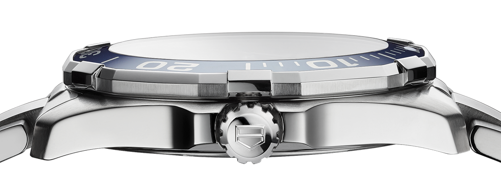 An extremely robust professional dive watch with a 43mm steel case and a Swiss-Made quartz movement. The eye-catching blue of the dial and 60-minute scale unidirectional turning bezel and flange is an Aquaracer signature, as is... the orange on the central hand. Water resistance: 300 meters.