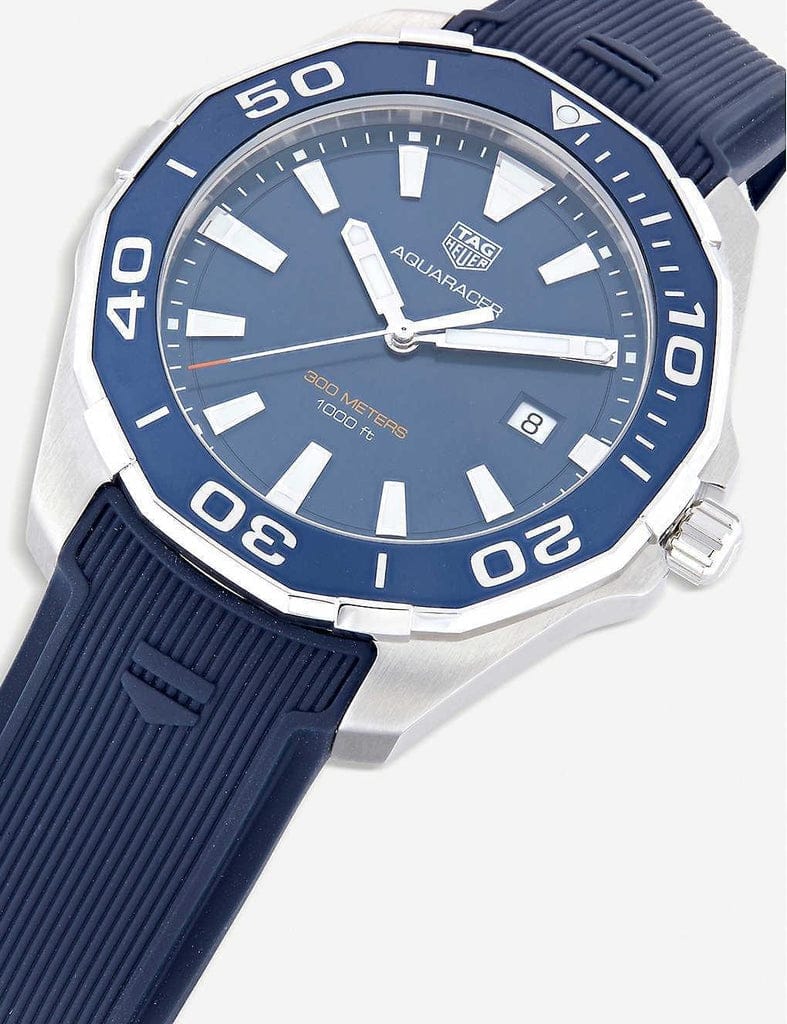 Taking inspiration from the depths of the ocean, this TAG Heuer Aquaracer men's watch is the ultimate sports watch. This beautifully made timepiece is fastened with a robust blue rubber strap and features a 43mm stainless steel case with a blue aluminium alternate finishing 60 minute scale unidirectional turning bezel.