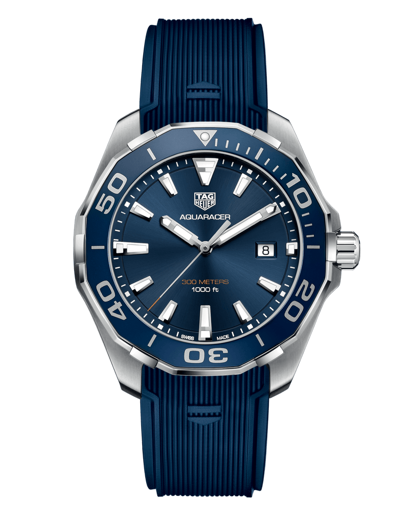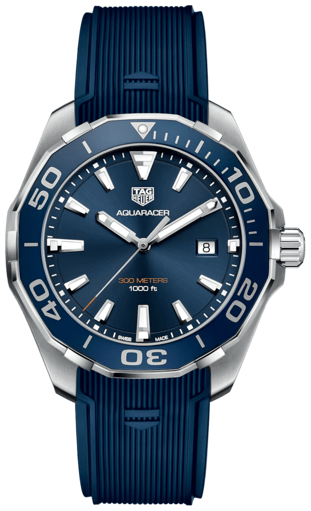 Flat and anti-reflective sapphire crystal protects the blue opalin dial that's enhanced by the blue flange, rhodium plated, polished and applied hour markers and hands with white superluminova, finished with a date window at 3 o'clock. Water resistant to an impressive 300m, this watch is powered by a Swiss made quartz movement. Whether you're in or out of the water, this TAG Heuer Aquaracer will be the perfect choice for every occasion. WAY101C.FT6153
