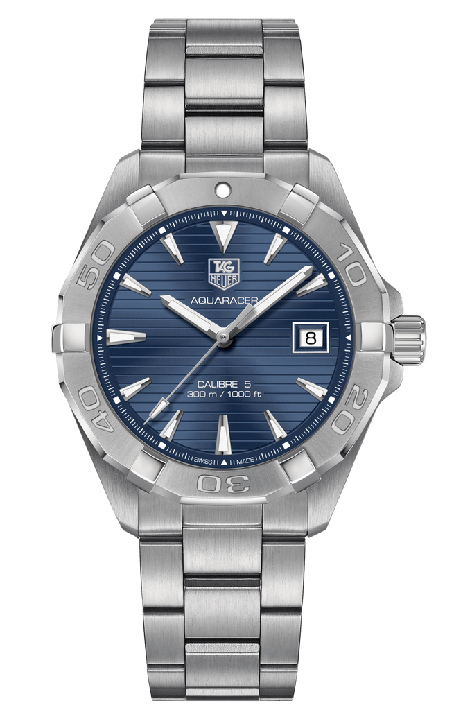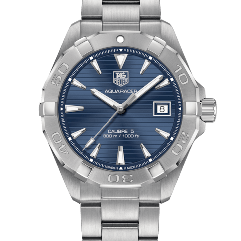 Tag Heuer Aquaracer Calibre 5 has a Stainless steel case with a stainless steel bracelet. Uni-directional rotating stainless steel bezel. Blue dial with luminous silver-tone hands and index hour markers. Minute markers around the outer rim. Dial Type: Analog. Luminescent hands and markers. Date display at the 3 o’clock position. Automatic movement with a 38-hour power reserve.