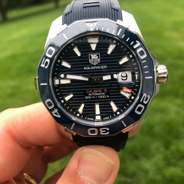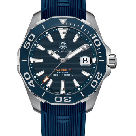 Designed for the modern man, the Tag Heuer Aquaracer Calibre 5 watch boasts a striking blue dial and comfortable blue silicone strap. With a precision Calibre 5 movement and durable construction, this timepiece is perfect for any active lifestyle. Elevate your style and performance with this expertly crafted watch.