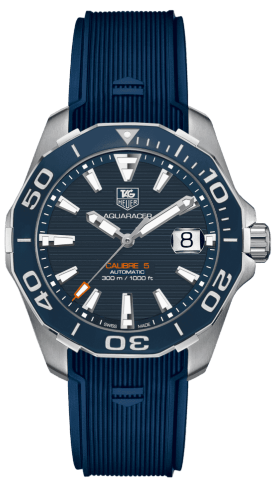 Swiss-made, this bold TAG Heuer Aquaracer is an aesthetic 41 mm watch. This model features a Steel case and a Calibre 5 Automatic movement.