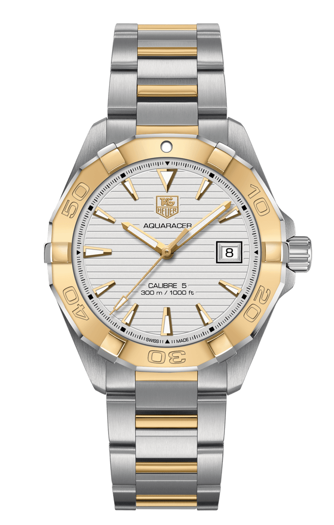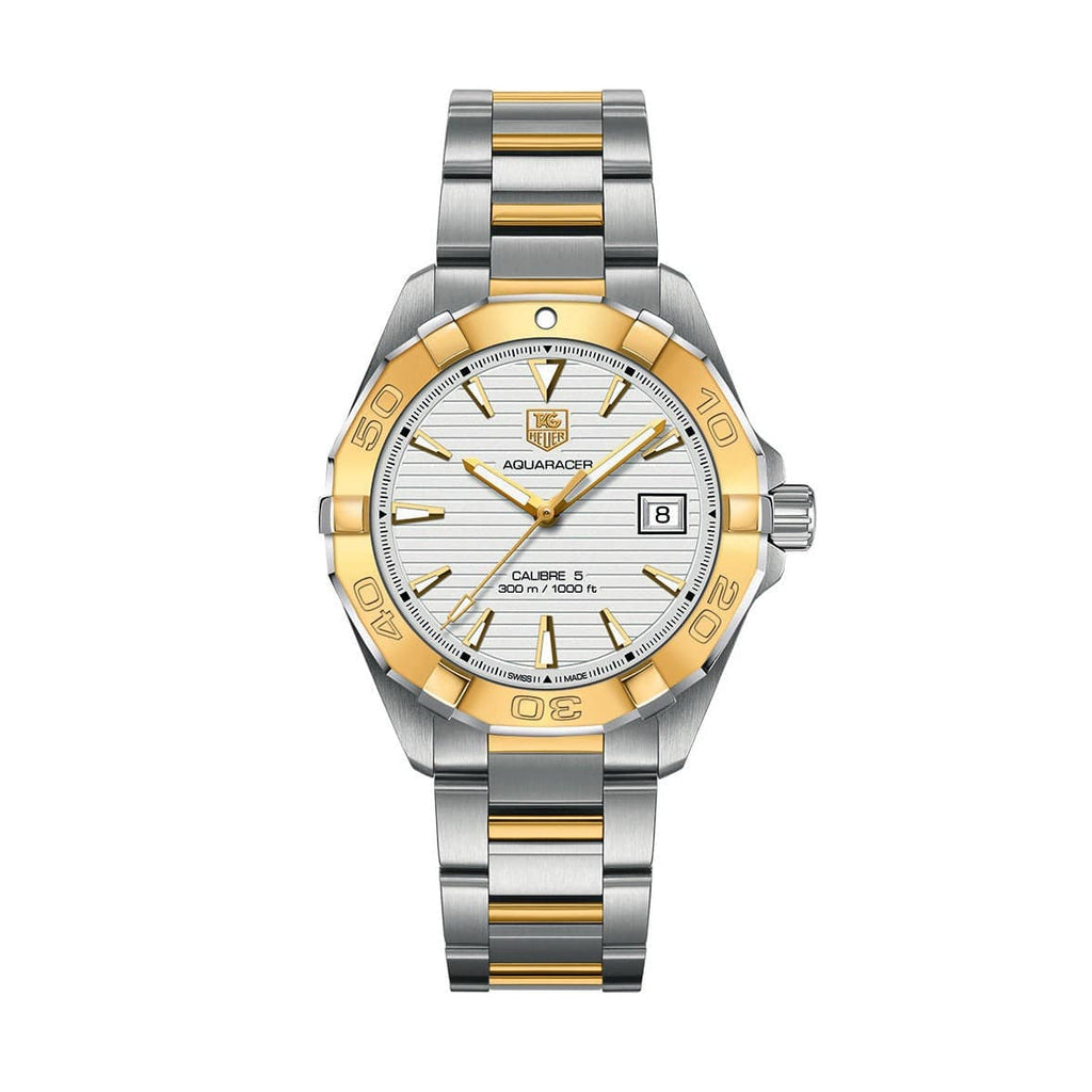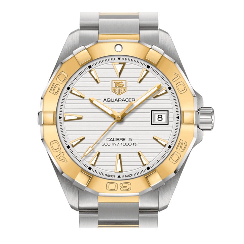 Swiss-made, this bold TAG Heuer Aquaracer is an aesthetic 41 mm watch. This model features a Steel and Gold case and a Calibre 5 Automatic movement.