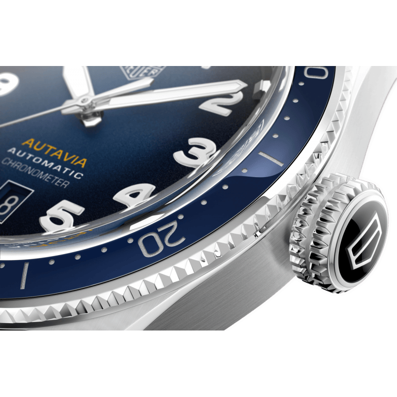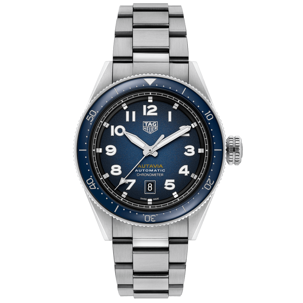 A curved double anti-reflective sapphire crystal further emphasize the Autavia’s at-a-glance readability. Vintage-inspired white Super-LumiNova® lume fills the polished hands and markers.