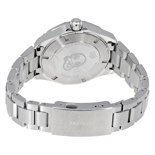 This 43mm sport watch features a stainless steel case, bracelet, and a black ceramic rotating bezel with a 60-minute scale. The black dial has luminescent hands and hour markers with a date window displayed at 3 o’clock. It is powered by the Tag Heuer Caliber 5 self-winding automatic movement with a 38-hour power reserve.
