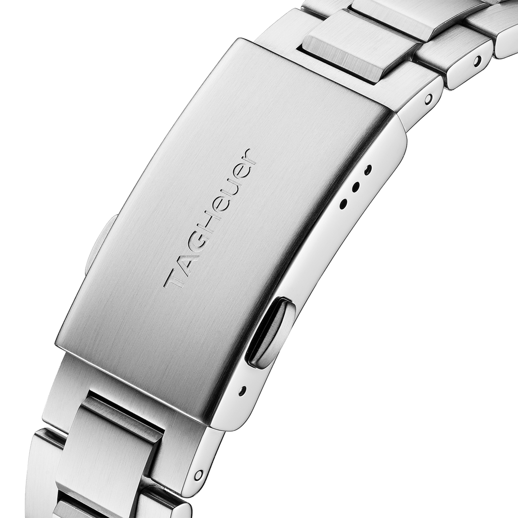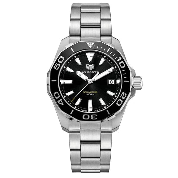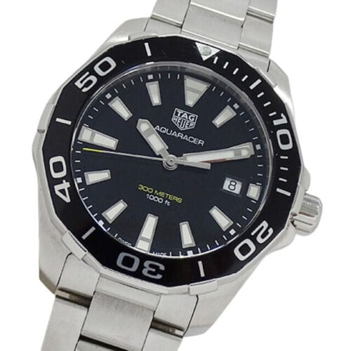 Stainless steel case with a stainless steel bracelet. Uni-directional rotating stainless steel bezel with a black aluminum top ring. Black dial with luminous silver-tone hands and index hour markers. Minute markers around the outer rim. Dial Type: Analog. Luminescent hands and markers. Date display at the 3 o’clock position. Quartz movement. Scratch resistant sapphire crystal. Screw down crown. Solid screw-in case back with diving bell engraving. Case size: 41 mm. Case thickness: 14 mm. Round case shape. Deployment clasp. Water resistant at 300 meters / 1000 feet. Functions: date, hour, minute, second. Sport watch style. Watch label: Swiss Made. Item Variations: WAY111ABA0928.