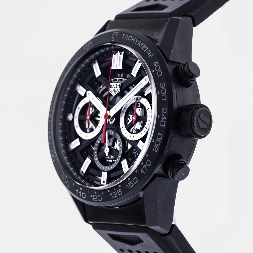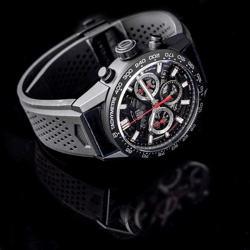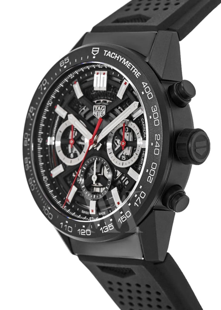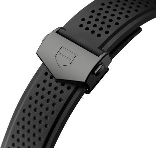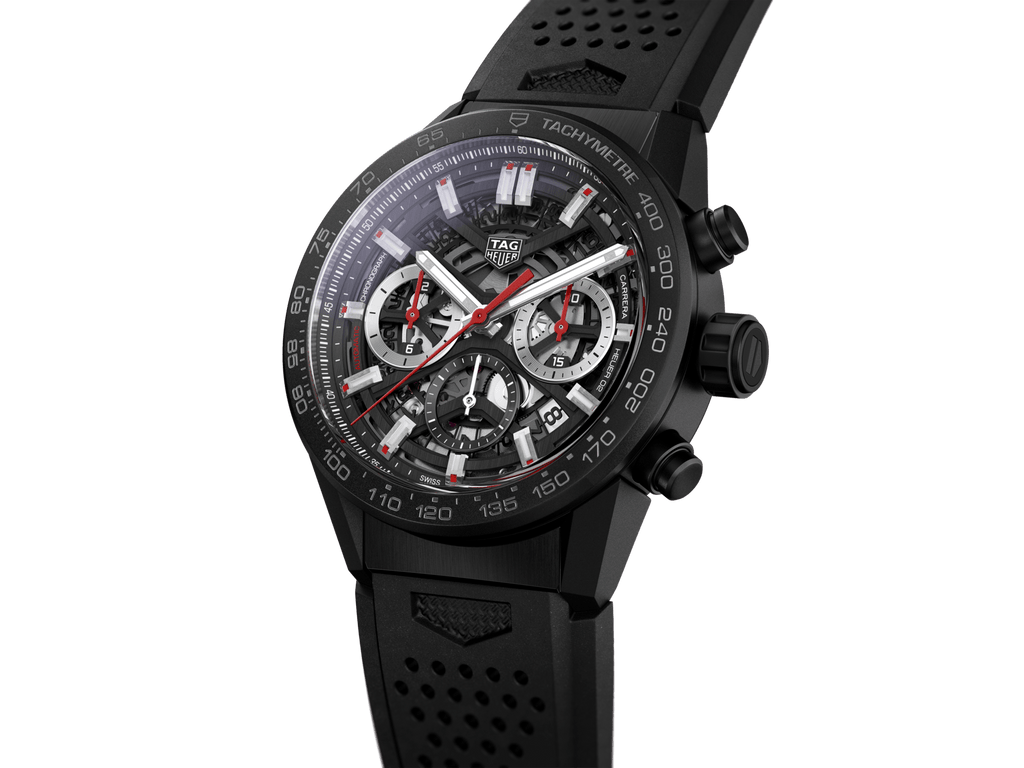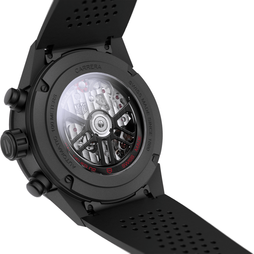 A black ceramic tachymeter chronograph, equipped with the new Manufacture Heuer 02 automatic movement, who has a stunning 80 hours power reserve. The black skeleton dial is matched with a racing-inspired strap in perforated rubber.