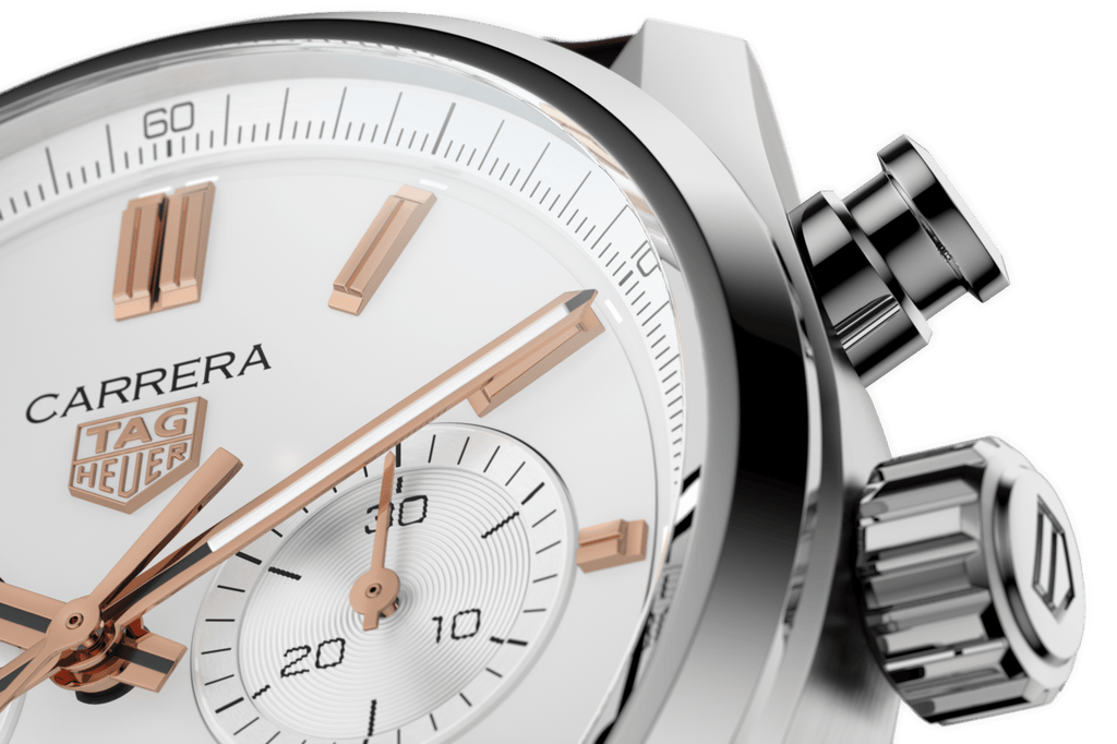 Gleaming fine-brushed steel case with steel crown, two pushbuttons and screw-down sapphire case back.