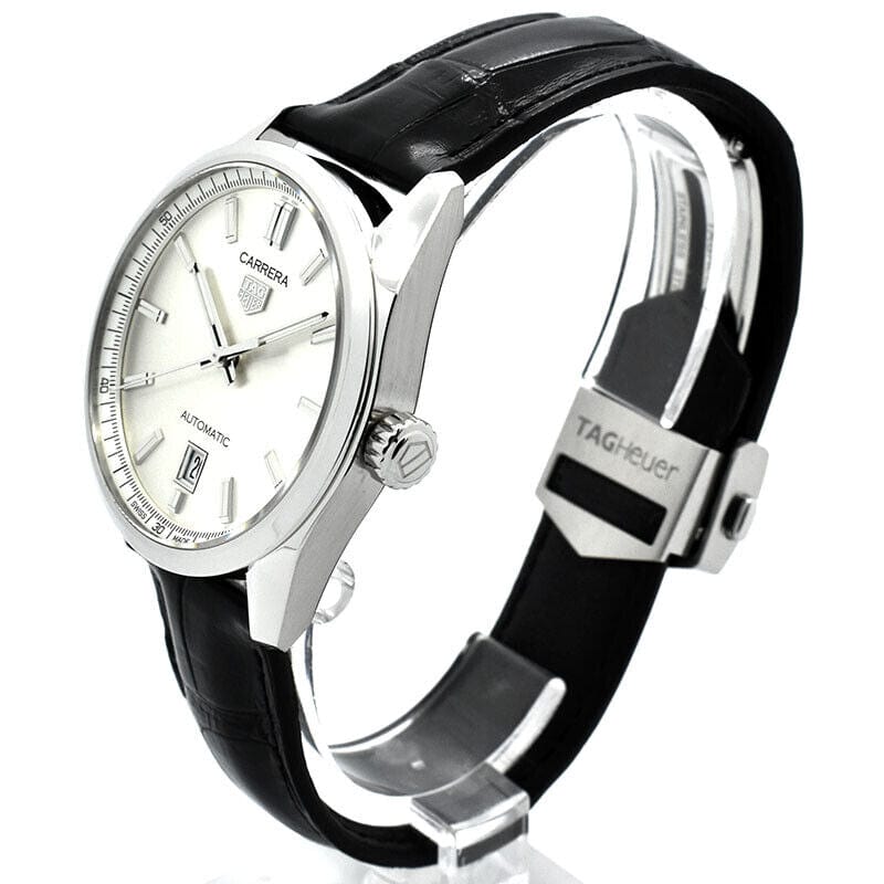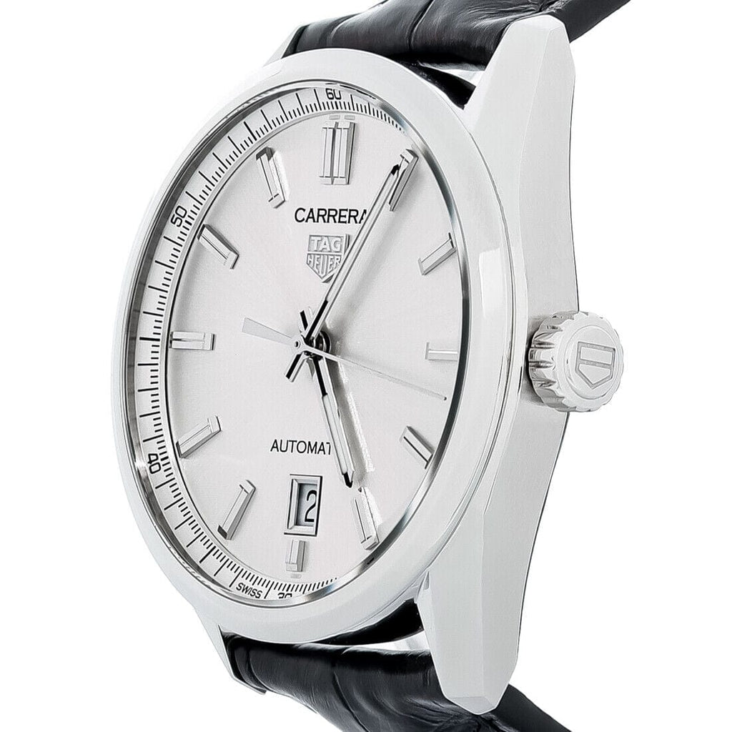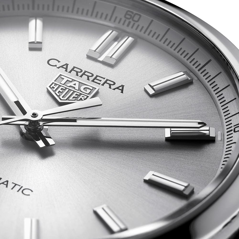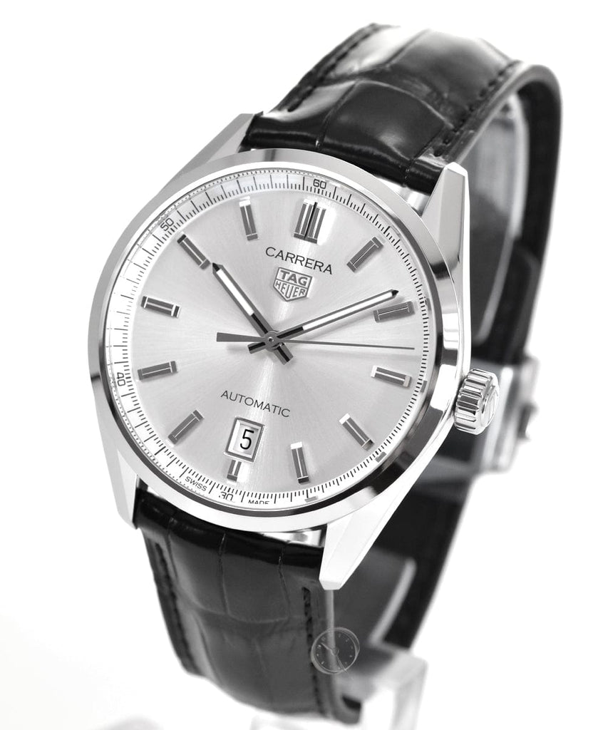 An iconic signature design, the TAG Heuer Carerra blends precision timekeeping with distinctive looks. The indulgent and showy silver sunray brushed dial is complemented by rhodium plated hands, hour markers, and an applied TAG Heuer shield.