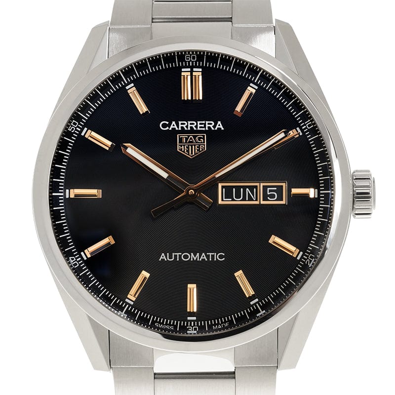 Black and gold combine for a striking luxury look on this resolutely determined TAG Heuer Carrera. With the convenience of a day and date display, there's function to back up the elegant form of this emblematic watch, perfect for those on-the-go.