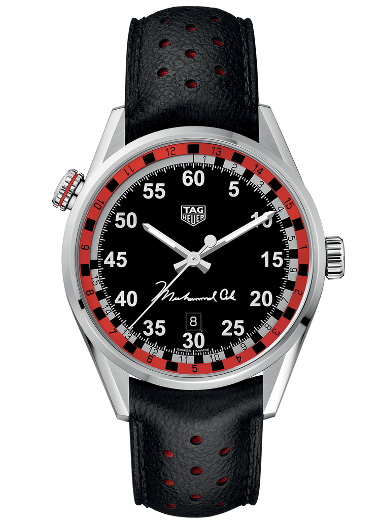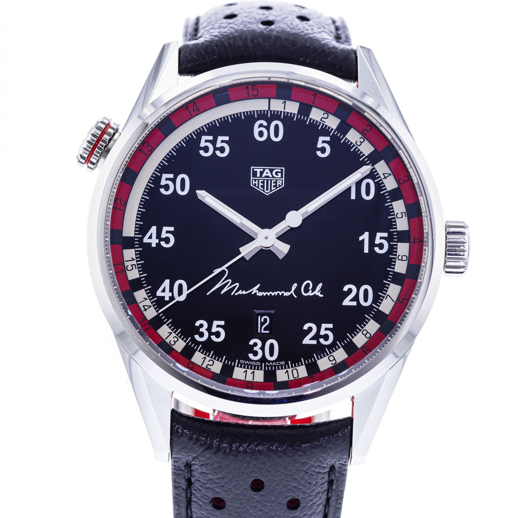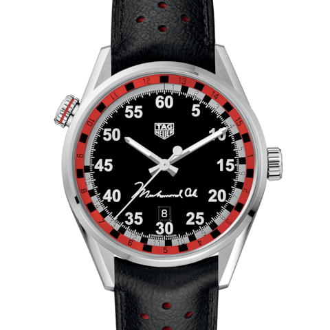 This special edition features an engraving of Muhammad Ali on the case back along with his signature printed on the dial above 6 o'clockPowered by an Tag Heuer Calibre 5 self-winding mechanical movement which contains 26 jewels and has an approximate 38-hour power reserve. Date display is located at the 6 o'clock position. Comes with Tag Heuer box, papers