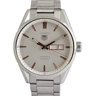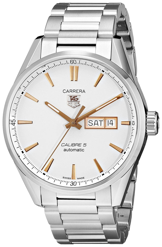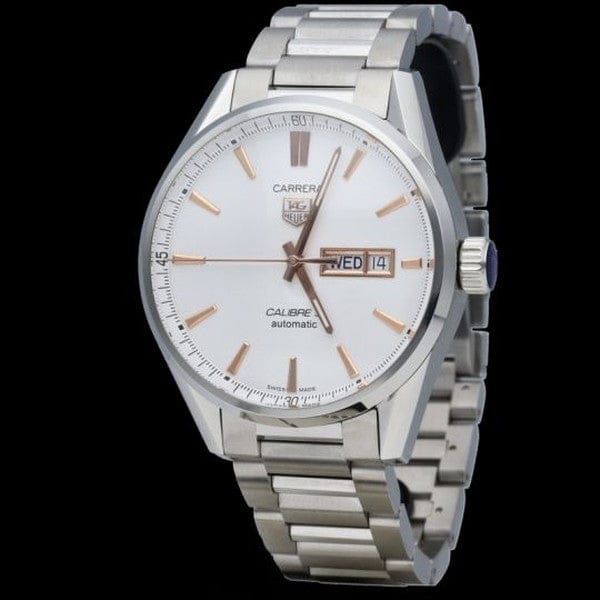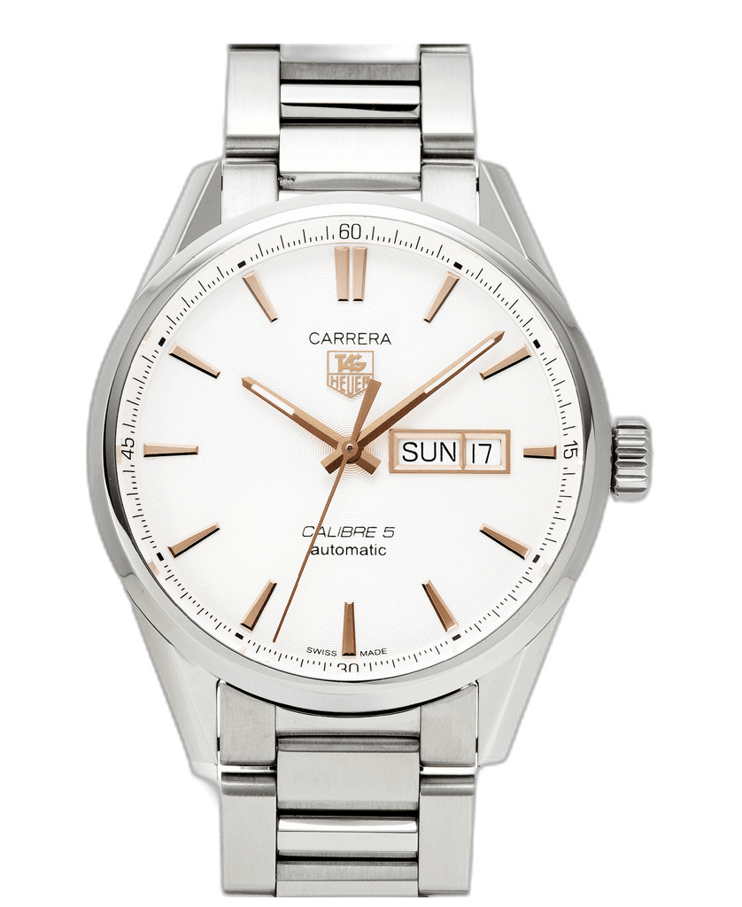 A stainless-steel watch with rose-gold plated detailing on its white dial. Powered by the robust Calibre 5 automatic movement, it comes on a steel bracelet fixed to the 41mm steel case by the iconic lugs of the TAG Heuer Carrera collection.