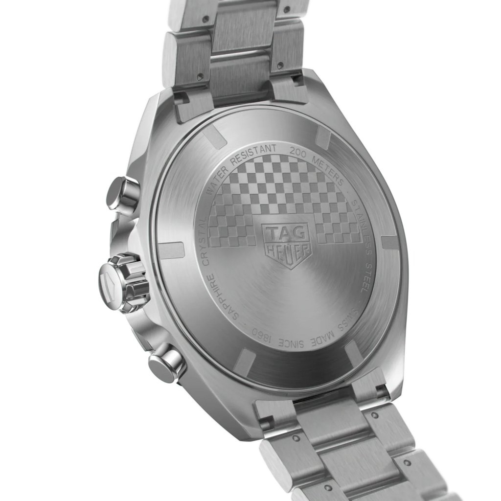 The robust steel bracelet has a double safety folding clasp to prevent accidental opening and a “Driver” extension for wearing over a racing suit. Water resistance is up to 200m.