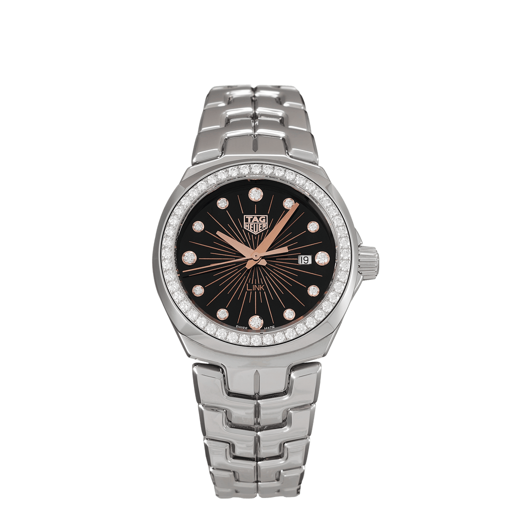 TAG Heuer Link Quartz Diamonds 32 mm watch. Model reference: WBC131G.BA0649. Stainless steel case set with 48 diamonds. Black dial set with diamonds. Quartz movement. Stainless steel bracelet. Swiss made. The watch comes in the original packaging, with a set of documents and 2 years warranty.