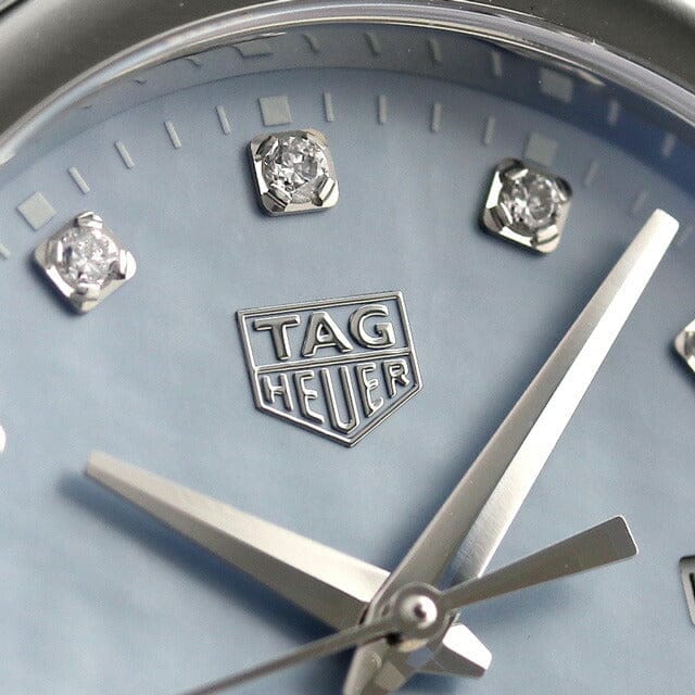 A 32mm stainless-steel, quartz-powered watch with 12 glittering diamond (0.116 CT) indexes on its luminous blue mother-of-pearl dial. Rhodium-plating on the hands and a silver polished TAG Heuer shield add extra luxury luster.