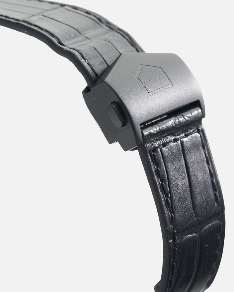 - Elegant 39mm black DLC titanium case with a daring black alligator leather strap