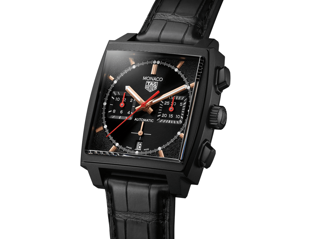 Paying tribute to the rare and mythical all-black Monaco of the 1970s, this statement timepiece is presented in an elegant 39mm black DLC titanium case, paired with a daring black alligator leather strap.