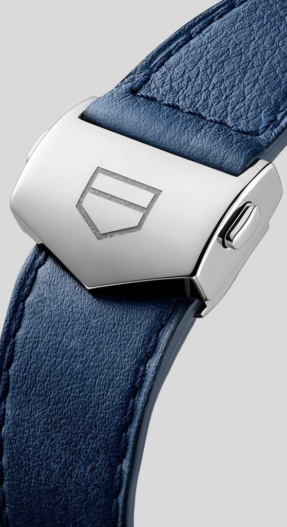 A perforated blue calf skin strap matches the mythical blue dial. The steel folding clasp boasts double safety push buttons and the TAG Heuer shield.