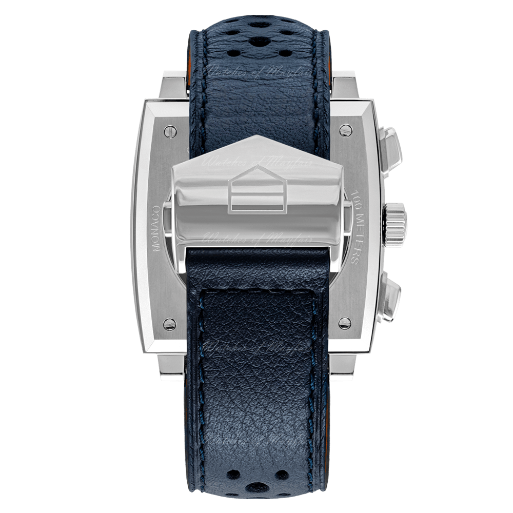 On the back, the TAG Heuer Monaco Gulf Special Edition has a unique version of the oscillating mass and column wheel with a special engraving colored to match the Gulf orange pantone. To complete the sporty but sophisticated look of the watch, the strap is made with of perforated blue calfskin leather and an orange lining.