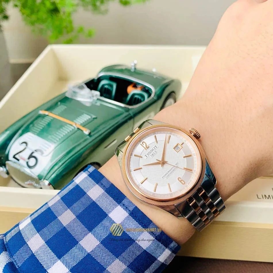 The watch face is divided into 3 distinct rings and is harmoniously designed with a blend of gold tones in the necessary details on a white background, making it stand out, easier to see and more luxurious. The minute markers are located on the outermost part of the watch face. Interspersed with the markers are even 5-minute numbers. The middle ring is the hour markers with a more modern Arabic numeral and bar system compared to the classic Tissot Le Locle. Tissot watch brand and the year of establishment 1853 is placed at the 12 o'clock position, which is quite recognizable and wants to emphasize the brand's history.