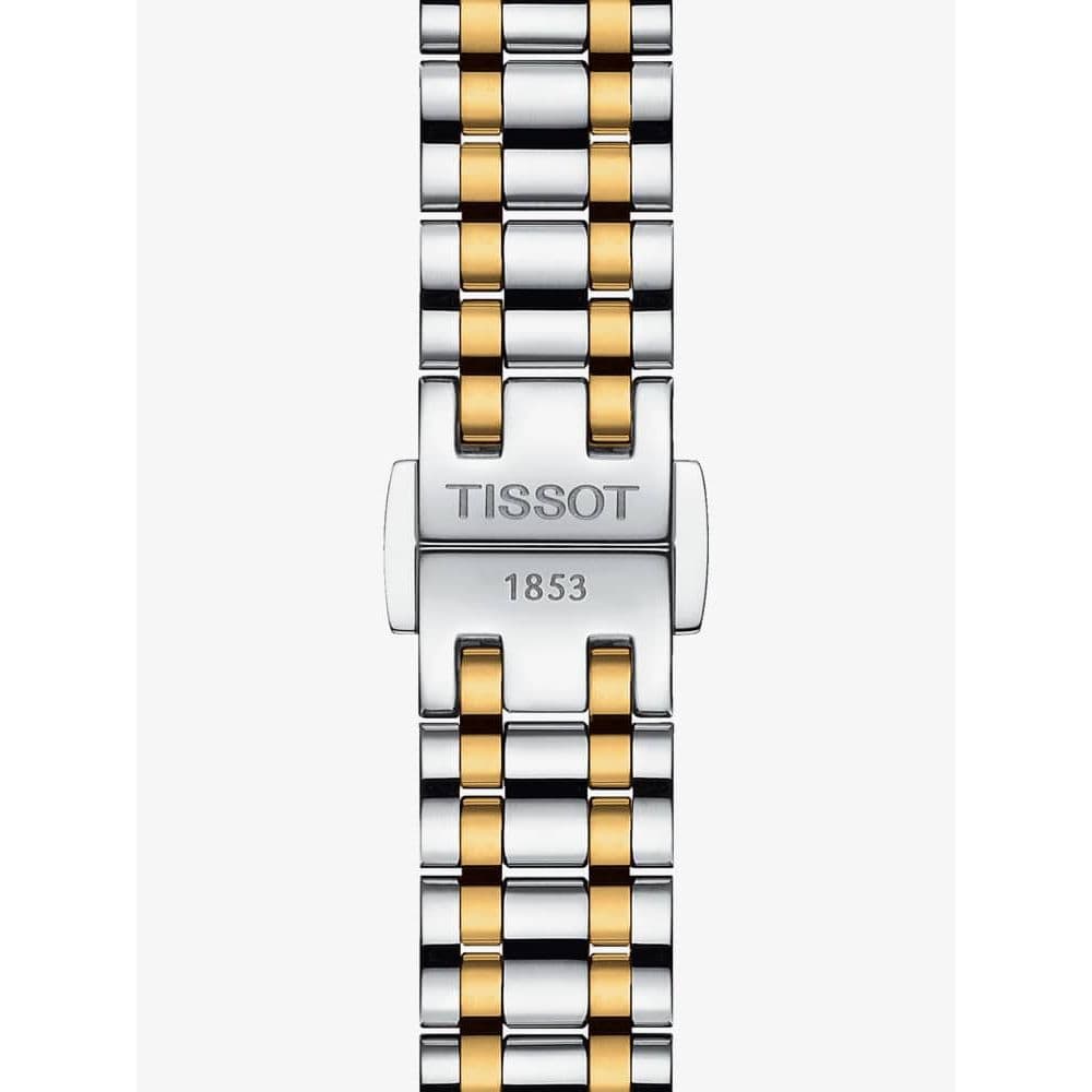 The Tissot Bellissima Small Two-Tone Lady Watch T126.010.22.013.00 combines a 26mm round-shaped stainless-steel case and a two-tone stainless-steel bracelet with a push-button deployment clasp. It has a silver-patterned analogue dial with black Roman numerals and a date window at 6 o’clock, protected beneath domed, scratch-resistant sapphire crystal glass with an anti-reflective coating. Power is generated by the Swiss quartz movement with an end-of-life indicator. This model also has a water resistance of up to 50 metres.