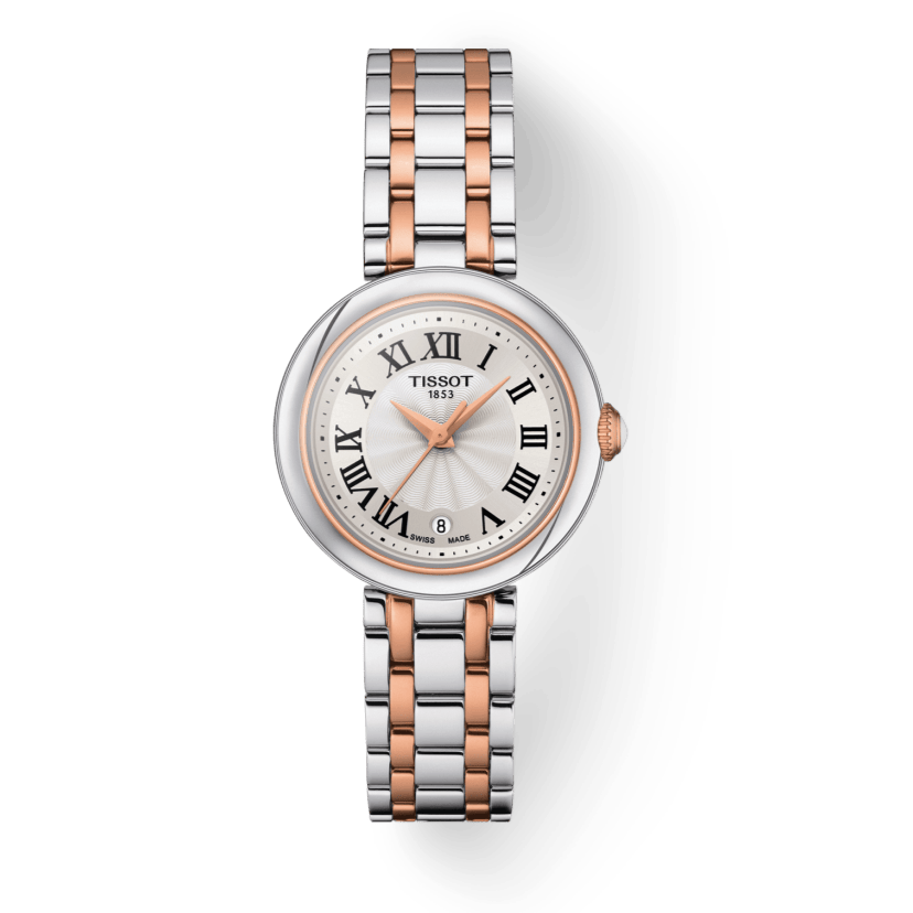Classic designs don’t come more timeless than the Bellissima Small Lady. The round case and five link bracelet are made of steel, with highlights in warm rose gold PVD that give the watch its luxurious feel and day to night versatility. The watch has a silver Roman numeral dial with a beautiful rose shaped guilloché pattern, while a final flourish is the dazzling white ceramic cabochon set into the crown. With these elegant details, the Bellissima Small Lady will remind her you love her every day.