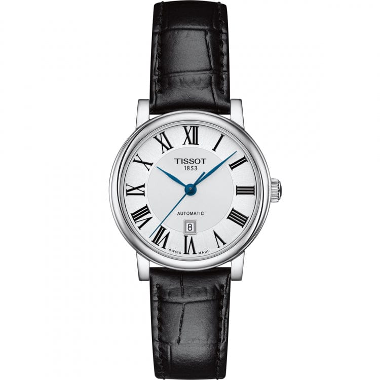 Stainless steel case with a black leather strap. Fixed stainless steel bezel. Silver dial with blue hands and Roman numeral hour markers. Dial Type: Analog. Date display above the 6 o'clock position. Caliber ETA 2671 automatic movement with a 38-hour power reserve. Scratch resistant sapphire crystal. Pull / push crown. Transparent case back. Round case shape. Case size: 30 mm. Case thickness: 9.5 mm. Band width: 15 mm. Tang clasp. Water resistant at 50 meters / 165 feet. Functions: date, hour, minute, second. Carson Premium Series. Casual watch style. Watch label: Swiss Made. Tissot Automatic Silver Dial Ladies Watch T122.207.16.033.00.